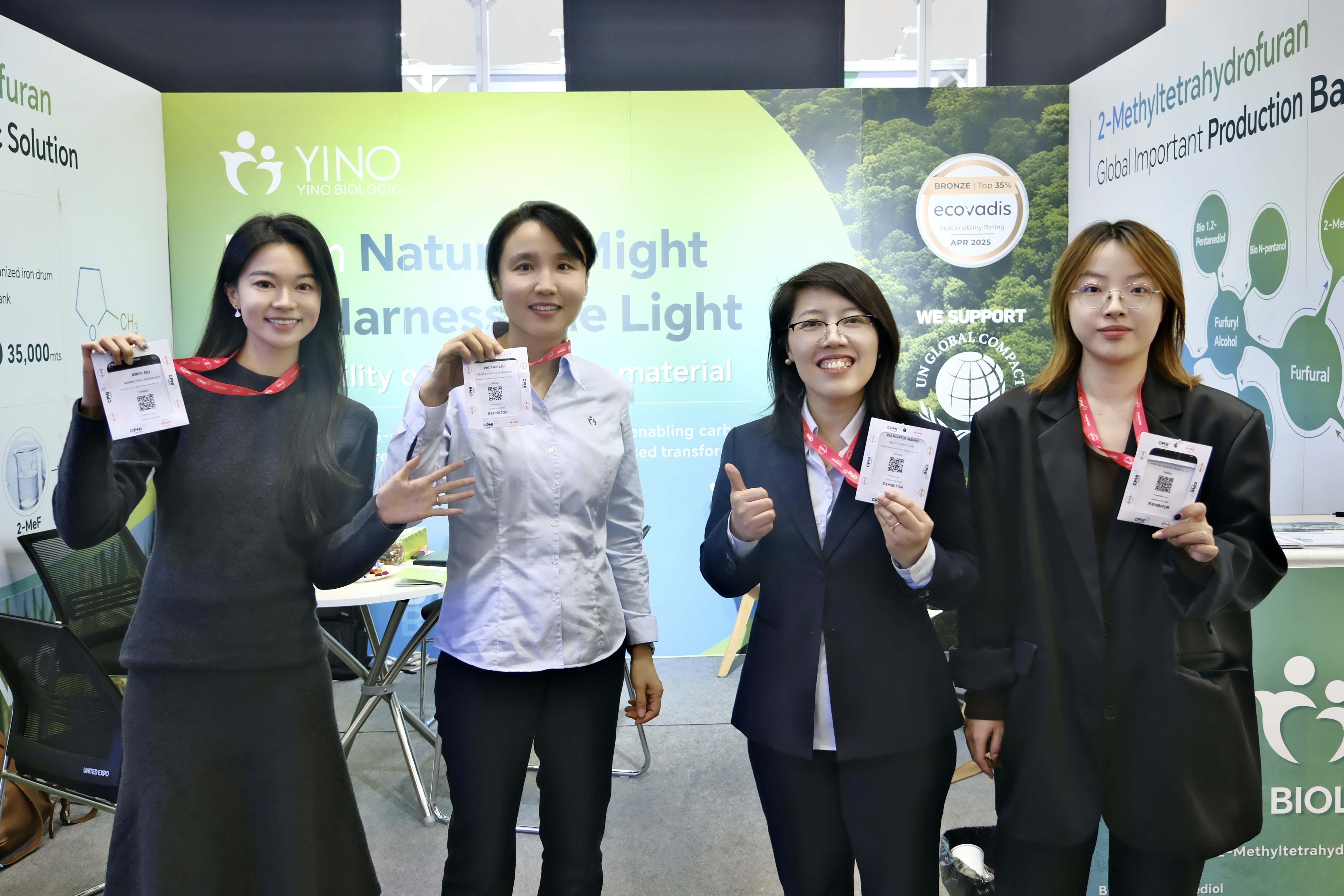 在制藥生產(chǎn)中,溶劑與原料的選擇不僅關系到工藝的安全性與環(huán)境友好性,更直接影響藥物純度和生產(chǎn)效率。YINO Biologic 以非糧生物質玉米芯為原料,從源頭實現(xiàn)碳減排與資源高效利用,構建了覆蓋從原料到終端制造的綠色供應鏈。本次展會上,公司重點展示了多款高性能可持續(xù)產(chǎn)品,包括可作為活性藥物成分(API)合成綠色溶劑的 2-Methyltetrahydrofuran(2-MeTHF),該產(chǎn)品可有效替代傳統(tǒng) THF,顯著降低揮發(fā)性有機物排放并提升反應安全性與效率;用于高端藥物保護基及精細化工中間體合成的關鍵原料 3,4-Dihydro-2H-Pyran(DHP);以及新一代高純度環(huán)狀酯原料 δ-Valerolactone(δ-VL),廣泛應用于藥物輔料及聚合物開發(fā)領域,充分展現(xiàn)了 YINO 在綠色化學與可持續(xù)材料創(chuàng)新方面的實力。